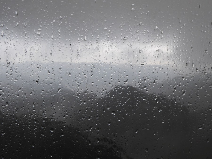 Not really. At the end of the train ride, rain pounded the concrete and the roof of the station. People getting on and off clutched umbrellas. I snuggled in my fleece for warmth. But the rain—the rain. My fleece was not a raincoat.