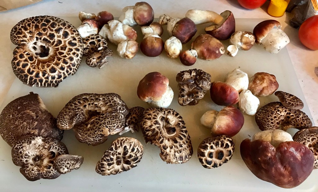 Down the hill and up again, through the brush we went, casting our eyes on the ground. We collected more boletes here and there, yelling whenever we found one.