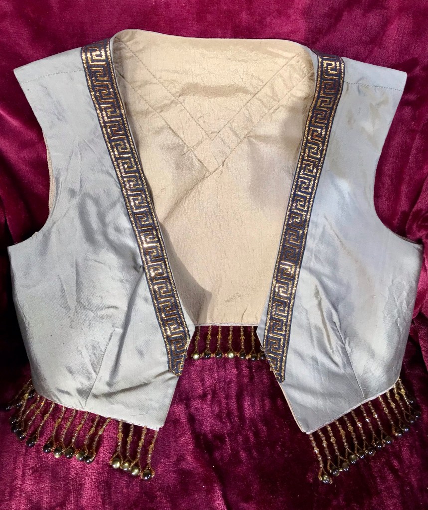 I designed my own costume—a swirling skirt of gold-splashed printed panels with ruffled hem and a matching vest. Both pieces were trimmed with gold and black ribbon. The most elegant feature of my outfit was the row of beads flopping around my abdomen and along the lower edge of my vest. No need for a scarf of coins around my waist.