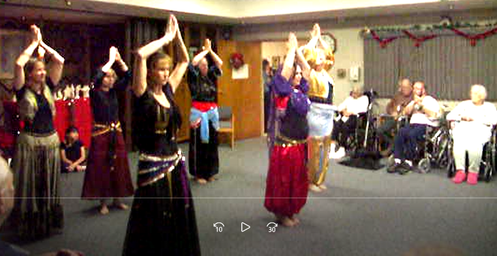 We were there to bring a little spark to their day. Our troupe of middle-aged gals had rooted through our closets and makeup drawers to create the most alluring appearances we could muster. “Anything exotic,” our instructor told us. So we brought out the glitz–the heavy eyeliner, flashy jewelry, metallic baubles, veils and swishing skirts, ballooning pants and voluminous hairpieces.