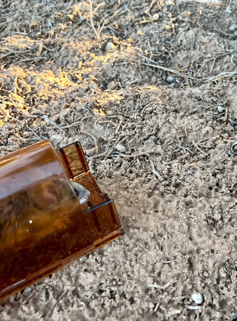 I continued trapping, noting each individual animal. Mouse Number 13 was a real heartbreaker. It stayed paralyzed in the trap, refusing to move when I opened the door. When I finally shook it out, it cowered on the ground for the longest time, shocked in its new environment. It limped away, unable to orient itself to dirt and juniper trees.