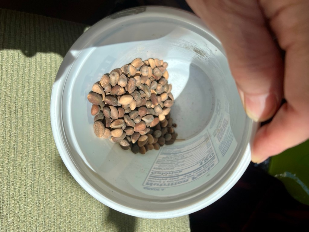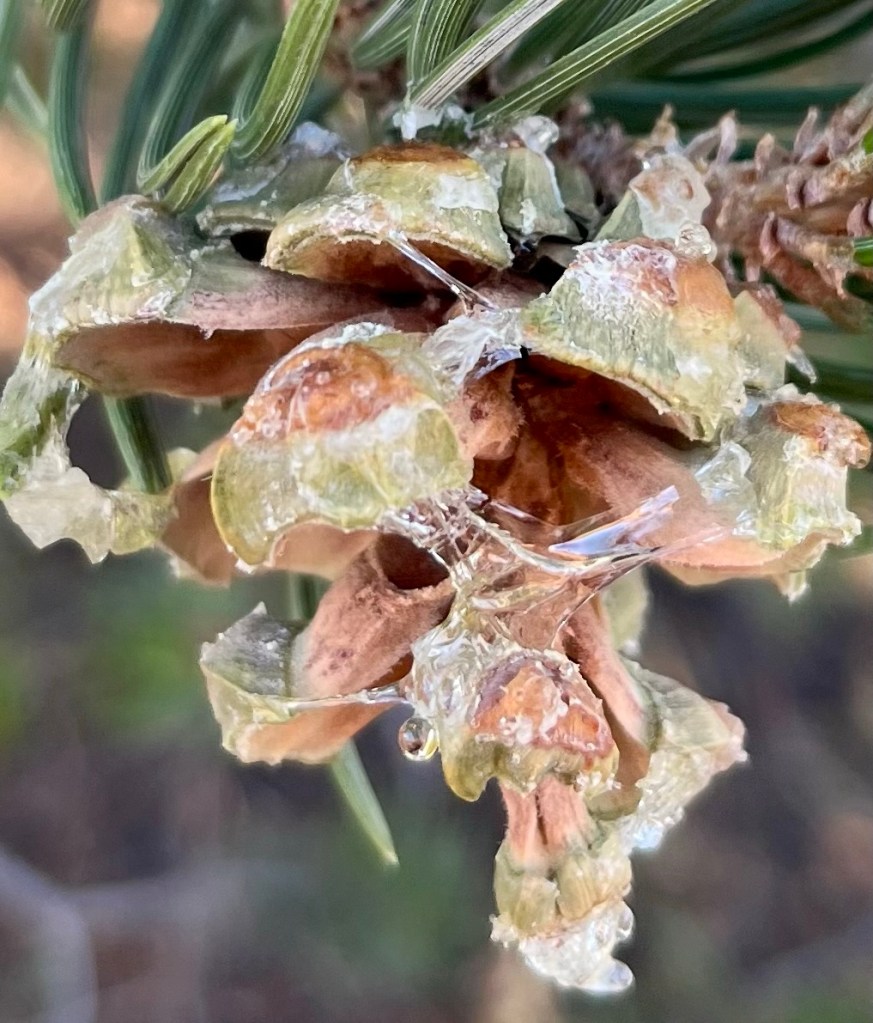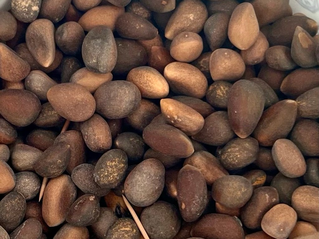 I pounded more branches with a stick and listened to the plopping of tiny nuts and dead twigs. I scanned the ground for the released morsels but couldn’t find them. It was better to remove them directly from the cones. I held a cone with one hand and pried with the other. Two nuts! Yay! I worked hard for those two nuts, though, and my fingers were a little sticky from the pitch dripping from the cone like honey.